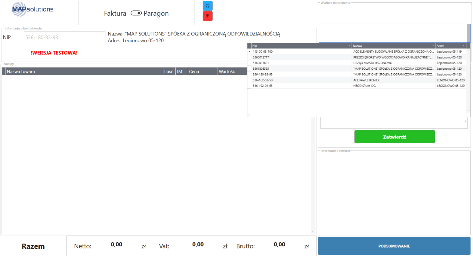 • szybkie wybieranie danych kontrahenta lub towaru za pomocą wyszukiwania przez wpisania pierwszych znaków NIP lub nazwy,